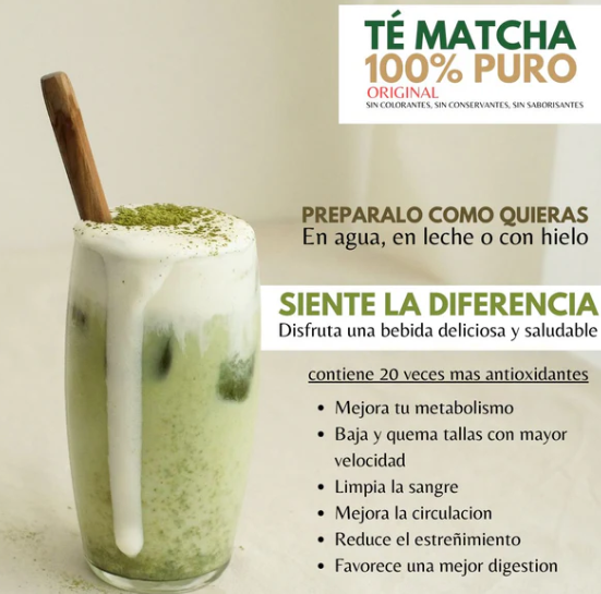 Combina tradición y salud, el té matcha es un té verde en polvo de alta calidad, conocido por su vibrante color, sabor único y sus beneficios para la salud. Rico en antioxidantes, aporta energía, mejora la concentración y es perfecto para bebidas y recetas.