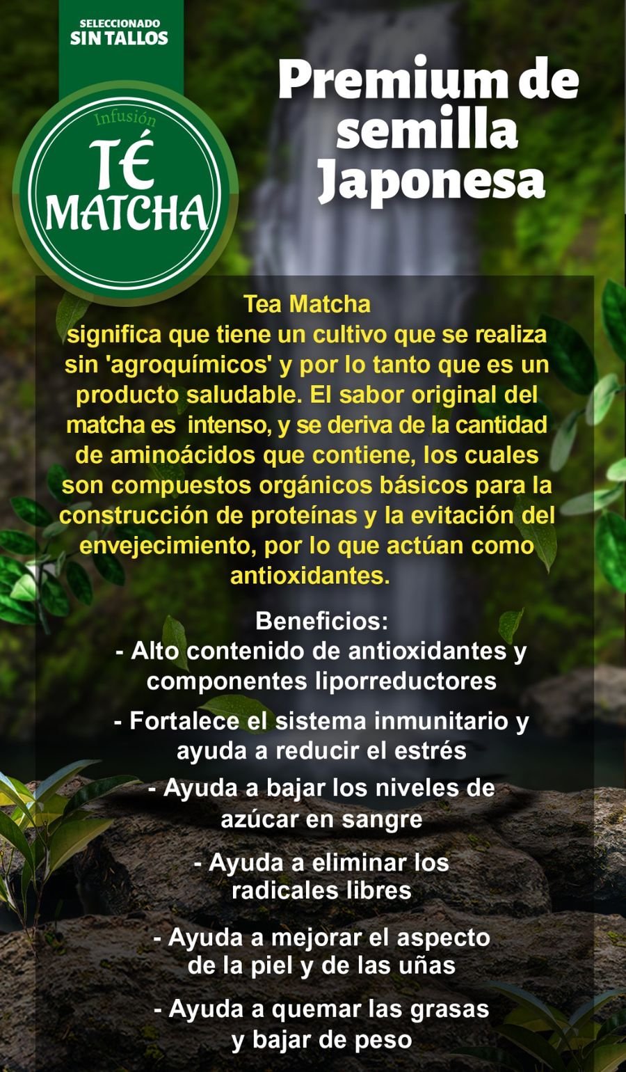 El té matcha es una joya de la tradición japonesa, elaborado a partir de las hojas más tiernas del té verde, molidas hasta obtener un polvo fino. Este superalimento se destaca por su color vibrante, su sabor suave con notas umami y su extraordinario perfil nutricional. Repleto de antioxidantes, vitaminas y aminoácidos, el matcha ofrece una experiencia única que combina bienestar y placer. Es ideal para energizar el cuerpo, mejorar la concentración y desintoxicar naturalmente. Ya sea en una taza cremosa, como ingrediente en batidos o en recetas innovadoras, el té matcha transforma cualquier momento en una pausa de armonía y vitalidad. Conecta con la esencia de la naturaleza y disfruta de un producto que ha sido valorado durante siglos por su pureza y beneficios.